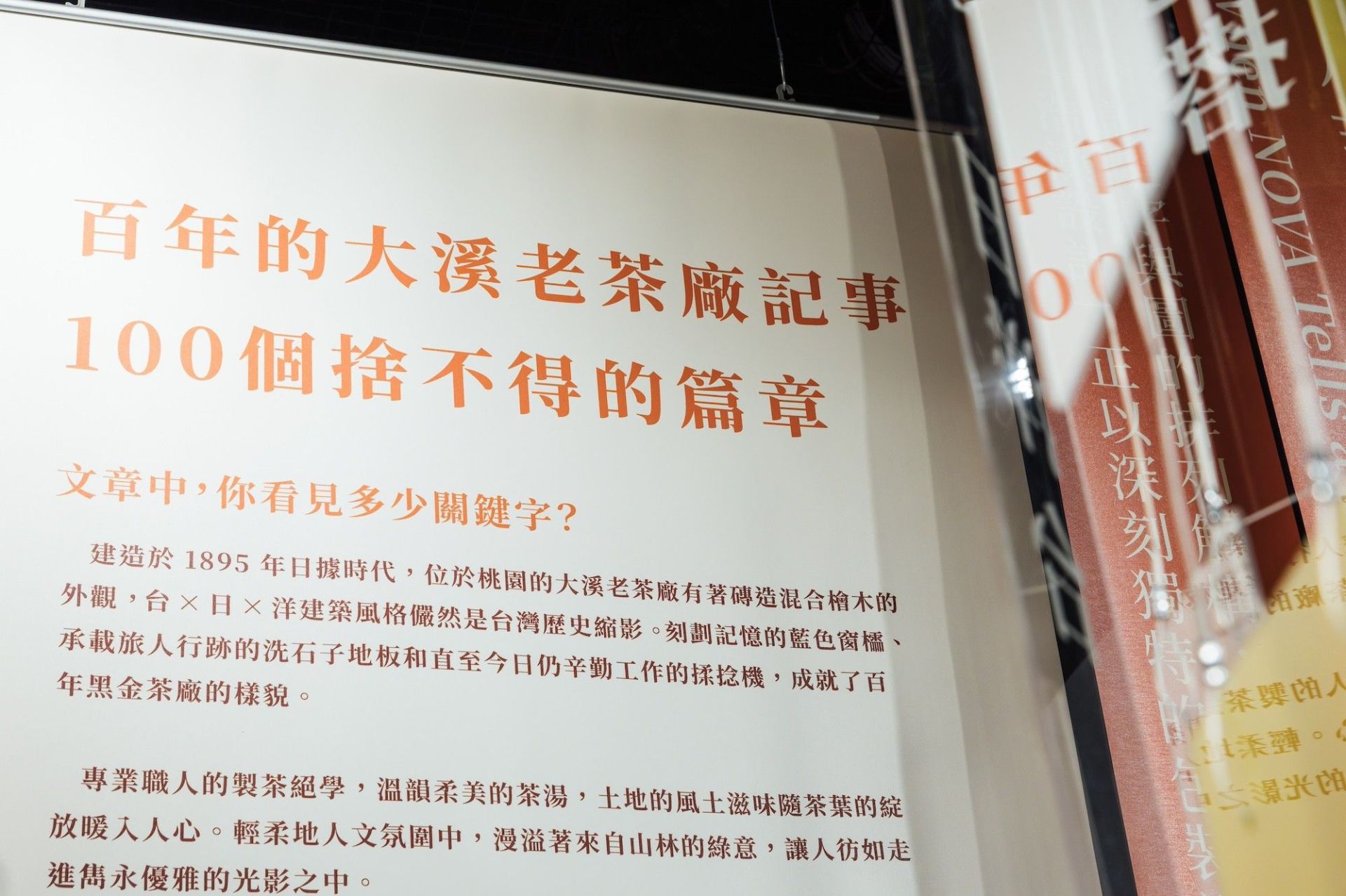 《用設計說故事 When NOVA Tells a Story》微型展,以簡短而豐富的文章〈百年的大溪老茶廠記事〉作為入口,邀請觀者透過閱讀認識大溪老茶廠,內容涵蓋其百年歷史歲月、混搭建築特色、運轉多時的揉捻機、空氣裡的風味茶香等。這些文字宛如一把鑰匙,轉開設計師面對大量資訊時的第一個直覺反應:在有限篇幅裡,你看見了什麼關鍵字?