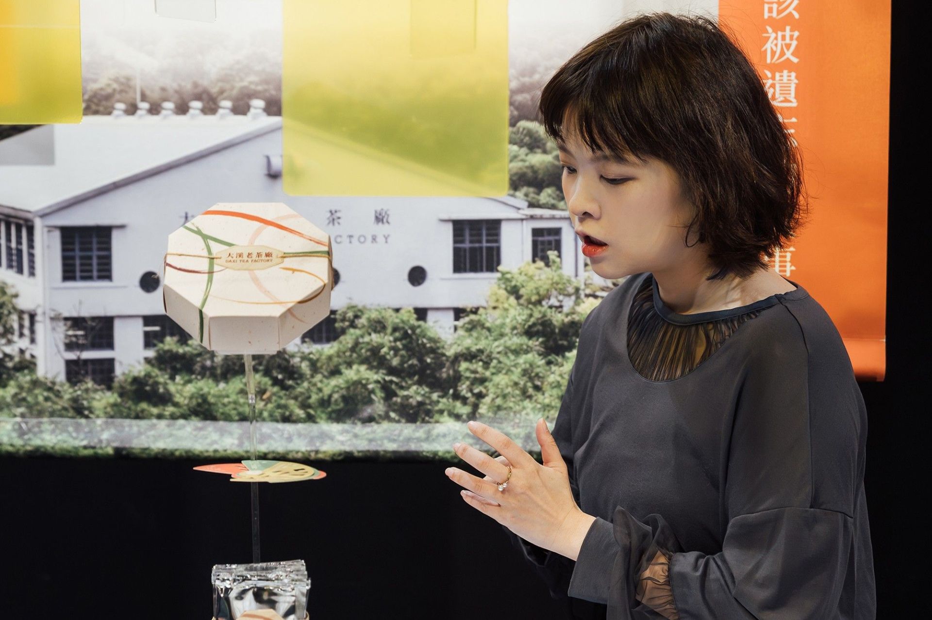 除了以傑克遜為主體,其他關鍵字激盪,也是造就百年禮盒的一環。展區中,浩漢產品設計將討論過程浮現的各個關鍵字以壓克力板懸掛在中間,被選用的詞彙如茶色、歷史、風味和韻等,特意注入黃色色底呼應茶湯,下方展桌中央則放置禮盒本體,營造由上而下淬煉靈感的過程。「像禮盒上的線條,對應的是茶葉滾動的狀態,以及融合其他關鍵字的轉化。」無論是禮盒本體,又或是微型展區的規劃,都展現出 NOVA DESIGN 如何在有限的空間內濃縮資訊,呈現跨越百年故事的設計能力。