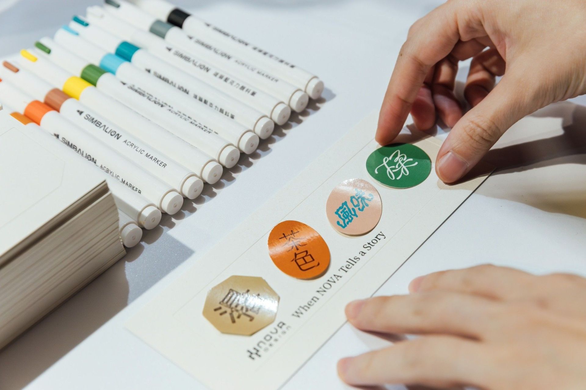 值得一提的是,NOVA DESIGN 希望大家不僅到場觀展、思索,也能實際體現靈感的激盪。展桌特別選用與禮盒一致的八角形,展示禮盒之餘,團隊亦將關鍵詞設計成貼紙,規劃自繪書籤互動區,讓觀者在現場圍成一圈,設計屬於自己的關鍵字書籤,「展場空間小,最大的挑戰便是簡化和聚焦,而當大家一起討論、畫畫時,無形間也跟著桌子轉動,讓禮盒的核心概念貫穿到實體中。」