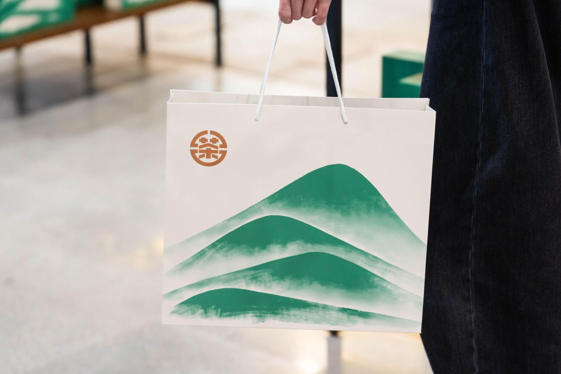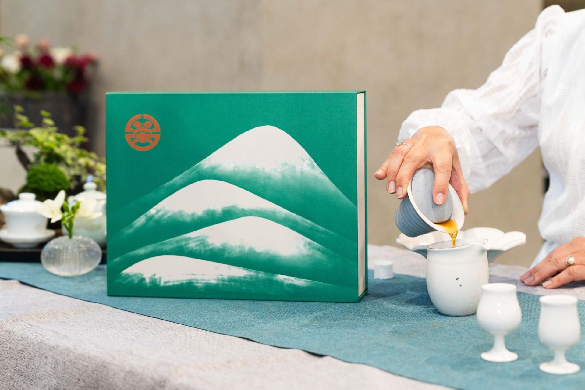 色彩方面,不同於常見的茶綠,團隊選用沉穩中帶有活力的綠調,使整體視覺在靜定之中保有靈動的氣息。材質與工藝的取捨,同樣體現了理性與感性之間的拿捏,團隊原先希望採用紋理明顯的紙材,強化手感與自然氛圍,然而因禮盒需歷經攜帶、堆疊甚至跨國運送等實際考驗,最終採以具保護性的水消加工方式,在確保結構強度與耐用度的同時,保留紙張本身的質地與溫度。細看盒面的山稜線,還可見到低調而閃爍的珠光效果,「我們選擇珍珠箔來進行製作,這個材質以往多用於背景,這次挑戰將它運用在圖案上,效果呈現得很不錯。」盒體在不同角度觀看下,近似霧氣瀰漫的朦朧層次,呼應且重現了山林環境的濕潤與流動。