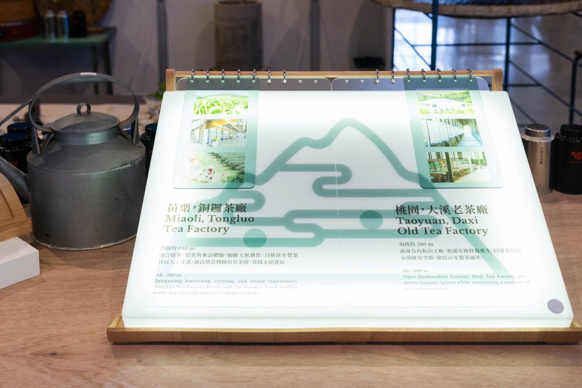 由產品設計師魏玉珊打造的掀動式展示裝置,將燈箱與手翻書融為一體,翻閱之間,觀者得以對應四座茶廠的地理位置與海拔高度,搭配實景照片與簡短文字的並置呈現,讓四座茶廠的樣貌在眼前立體成形,「不管是台灣農林的夥伴,還是前來參觀的嘉賓,對這個設計都非常感興趣,停下腳步想探究更多。」